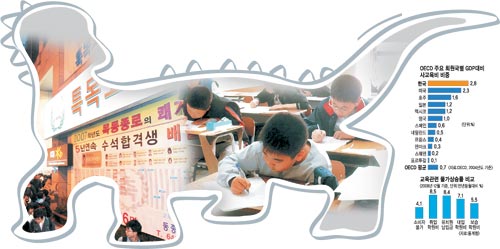 이를 반영하듯 사교육 시장의 규모도 팽창일로다. 한국학원총연합회에 따르면 2007년 전국 입시학원수는 2만9000여개로 2000년(1만1000여개)에 비해 2.5배 이상 늘었다. 교육과학기술부에 따르면 지난해 말 현재 전국의 입시·보습학원은 3만4257개로 5년 전에 비해 67.3% 늘어났다.