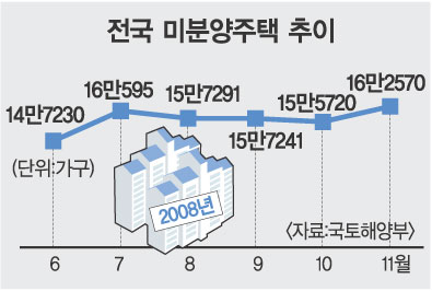 [쿠키 경제] 국토해양부는 지난해 11월 현재 전국 미분양주택은 총 16만2570가구로 10월(15만5720가구)보다 6850가구 늘었다고 29일 밝혔다. 정부가 미분양 집계를 시작한 1993년 이후 최고치로 지난해 7월(16만595가구) 기록을 경신한 것이다.