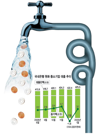 금융위원회는 4일 1차 건설·조선 구조조정 대상 기업 지원책을 발표한 데 이어 5일 예정에 없던 ‘1월중 중소기업 대출실적’ 브리핑에 나섰다. 9개 금융공공기관에 대해 정부의 중소기업·서민 금융지원 정책이 제대로 집행되고 있는지를 감사하겠다는 계획도 내놨다. 이명박 대통령이 “기업들이 노력하는 만큼 정부가 뒷받침을 해주자”고 독려한 데 따라 속도전에 나선 것으로 보인다.