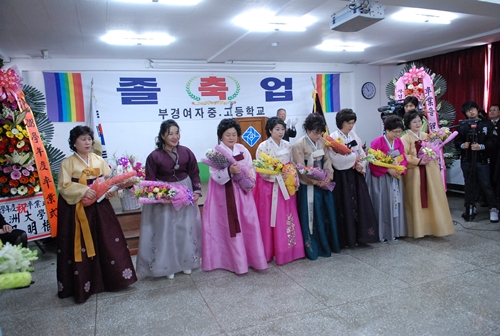 성인 여성들을 위한 학력인정학교로 국내 처음으로 2001년 문을 연 부산 장림동 부경여자중·고교가 6일 졸업식을 열었다. 졸업생은 30대 주부에서 70대 할머니까지 모두 262명(중학생 151명, 고교생 111명)이다.