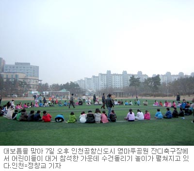 7일 오후 3시부터 4시간여동안 인천 운서동 공항신도시 영마루공원과 공항철도 운서역 건너편 토지공사 수용지역 공터에서 열린 제1회 정월대보름 유소년 전통놀이 체험행사에 기존 마을 사람들과 신도시 주민들이 300여명 가량 참여해 성황을 이뤘다.