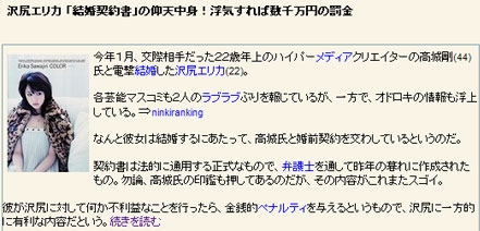 [쿠키 톡톡] 22살의 연상 비디오아티스트 겸 DJ와 올해 1월 결혼한 일본 톱배우 사와지리 에리카(22)가 엽기적인 결혼 계약서로 구설수에 올랐다.