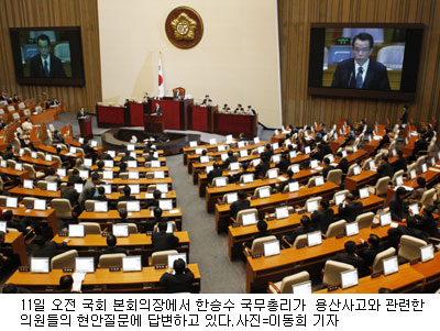 여야는 11일 국회 긴급현안 질문에서 용산 참사의 원인과 책임 소재를 놓고 정면 충돌했다. 특히 여당의원들은 이번 참사를 “반 국가세력의 불법포격시위’에 따른 것으로 규정하면서 시종 거친 언사를 동원, 시위대와 야당에 맹폭을 가했다.