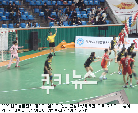 [쿠키 스포츠] 핸드볼큰잔치가 열리고 있는 서울 잠실 학생체육관 경기장이 핸드볼 경기를 하기에 적합하지 않다는 지적이 제기되고 있다.