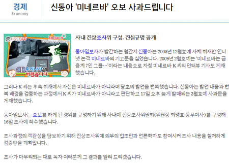 동아일보는 17일 본지 1면에 사과문을 싣고 “후속취재 과정에서 K씨는 스스로 미네르바가 아니라고 당초의 발언을 번복했다”며 “K씨는 미네르바 아니라고 판단했다”고 인정했다. 동아일보는 17일 오후 발간될 신동아 3월호에 이와 관련 사과문을 게재했다고 밝혔다.