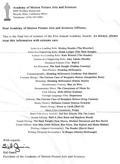 이 문서에 따르면 영국 출신 대니 보일 감독의 영화 ‘슬럼독 밀리어네어’가 최우수 작품상과 최우수 감독상의 영광을 안을 예정이며 15년간 방황한 끝에 화려하게 재기한 미키 루크(더 레슬러)가 남우 주연상을, 다크 나이트의에 출연한 故 히스 레저는 남우 조연상을 받는다고 적혀있다.