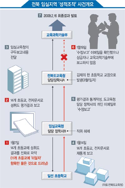 ◇책임전가 급급=전북도교육청은 23일 임실 지역 학업성취도 평가 오류 사건을 조사한 결과 임실교육청 담당 장학사 A씨가 지난 1월 7일 전화로 일선 학교의 평가 결과를 조사해 도교육청에 보고했다고 했지만 이는 사실이 아닌 것으로 파악됐다고 밝혔다.