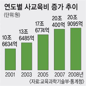 [쿠키 사회] 경기불황에도 사교육비는 오히려 늘어났다. 지난해 우리나라 총 사교육비는 전년보다 8700억원 가량 증가한 20조9095억원으로 추정됐다.