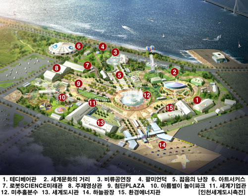 주행사장은 중앙부에 더위를 식혀줄 축전 분수시설과 꽃 전시장을 중심으로 환경에너지존, 첨단기술존, 문화예술존(세계 문화의 거리), 도시·기업존 등이 주변에 들어선다. 중앙공원에 도시축전 기념시설로 세울 도시계획관과 ‘트라이 볼’(Tri-Bowl)이 보조행사장으로 활용된다. 송도컨벤시아가 콘퍼런스 장소로 사용되고, 도시개발공사가 짓는 투모로우 시티는 U시티 체험관으로 이용된다.