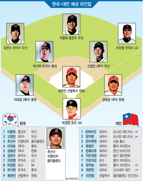 한국의 선발투수로는 에이스 류현진(한화)이 등판할 것으로 예상된다. 류현진은 일본에 도착해 평가전에 등판하지 않고 대만전 일정에 맞춰 컨디션을 끌어올린 것으로 전해졌다. 중반 이후에는 봉중근(LG), 장원삼(히어로즈) 등 좌완 계투조가 투입돼 대만의 좌타 라인을 봉쇄한다.