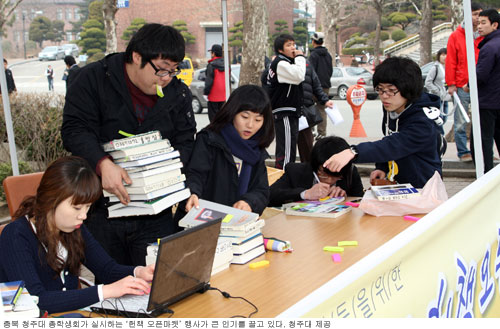 [쿠키 사회] 충북 청주대 총학생회가 선배들이 사용하던 전공교재를 정가의 반값에 사들여 후배들에게 구입 가격 그대로 되파는 ‘헌책 오픈마켓’ 행사가 폭발적인 인기를 얻고 있다.
