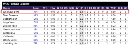 11일 WBC 공식홈페이지(http://web.worldbaseballclassic.com)에 따르면 봉중근은 이번 대회에 참가한 전체 투수를 통틀어 방어율(0.00), 승리(1승), 투구이닝(8⅓) 부문 1위를 달리고 있다. 방어율이 0.00인 투수는 봉중근 외에도 30명이나 있지만, 11일 오전까지 6이닝을 초과해 던진 투수는 봉중근이 유일하다.
