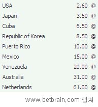 쿠바(배당률 6.50배)가 3위에 올라있고, 한국 뒤로는 푸에르토리코(배당률 10.00배), 멕시코(15.00배), 베네수엘라 (20.00배), 호주(31.00배), 네덜란드(61.00배) 순이다. 국민일보 쿠키뉴스 조상운 기자