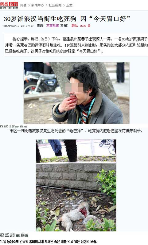 지난 10일 동남조보(東南早報)를 비롯한 중국 취엔저우(泉州) 지역 언론들에 따르면 9일 이 지역 한 공원에서 30대 후반의 남성이 죽은 개를 날로 먹고 있는 모습이 발견돼 지나가던 행인들을 경악하게 했다.