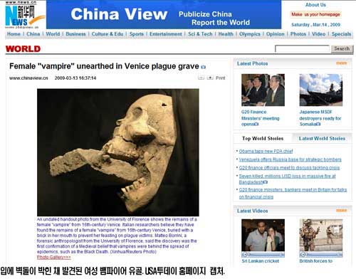 이탈리아 플로렌스대 인류학과 연구팀은 1576년 흑사병이 창궐했던 당시 사망한 사람들을 묻었던 베니스 인근 집단 무덤에서 입 안에 벽돌을 넣은 채 잘 보존돼 있는 여성 유골을 처음 발견했다고 14일(한국시간) AP통신이 보도했다.