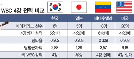객관적인 전력은 한국팀이 가장 약하다. 한국팀에서 현역 메이저리거는 추신수(클리블랜드) 1명에 불과하다. 일본은 5명, 베네수엘라 18명, 미국은 28명이다.