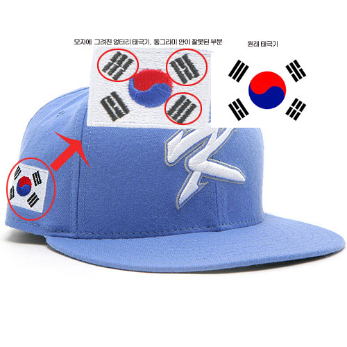 MLB 홈페이지 온라인 쇼핑몰은 제2회 WBC에 참가하는 각국의 유니폼과 모자 등 기념품을 판매하고 있다. 한국과 관련된 제품은 모두 7개. 이중 파란색 모자 측면에 수 놓아진 태극기를 자세히 살펴보면 모양이 이상하다.