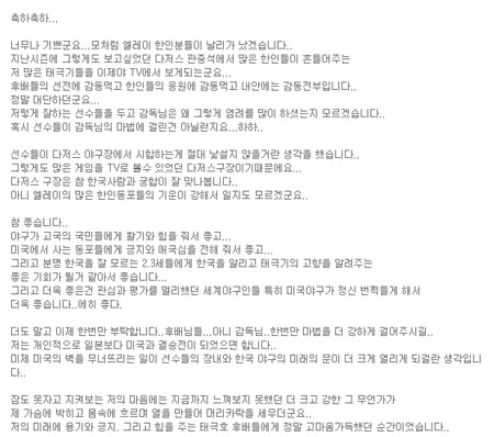 박찬호는 “야구가 고국의 국민들에게 활기와 힘을 줘서 좋고 미국에서 사는 동포들에게 긍지와 애국심을 전해 줘서 좋고 한국을 잘 모르는 2,3세들에게 한국을 알리고 태극기의 고향을 알려주는 좋은 기회가 될 거 같아서 좋다”며 “더욱 좋은건 관심과 평가를 멀리했던 세계야구인들 특히 미국야구가 정신 번쩍들게 해서 더욱 좋다”고 적었다.