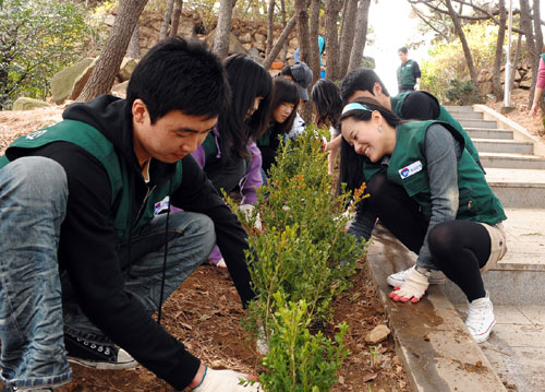[쿠키 사회] 부산은행 지역봉사단(단장 이장호 은행장) 50여명은 범일동 자성대공원에서 향나무, 사철나무, 도장나무 등 100여그루를 최종림 문화재관리원등 자성대공원 자원봉사원들과 함께 심는 식목행사를 가졌다고 23일 밝혔다.