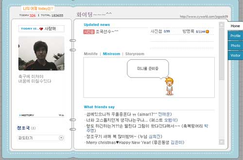정조국은 26일 자신의 미니홈페이지를 ‘TODAY IS...촎 사랑해’라고 꾸몄다. 전날 연인 김성은이 자신과의 열애 사실을 공식적으로 언급한 것에 대한 반응으로 보인다.