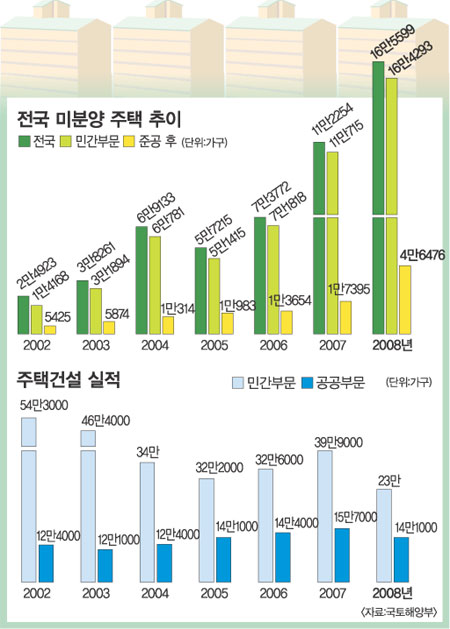 권주안 주택산업연구원 금융경제연구실장은 “극심한 분양시장 침체로 미분양이 1995년(15만가구) 수준을 상회하고 있다”며 “분양여건 악화로 건설사 공급계획도 크게 위축될 전망이어서 향후 공급부족이 발생할 수 있다”고 지적했다. 실제로 미분양 적체 등 분양시장 위축으로 민간 주택건설 실적은 2007년 39만9000가구에서 지난해 23만가구로 크게 줄었다.