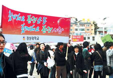 [쿠키 사회] 경성대 총학생회는 3일 1000여명의 학생들이 참가한 가운데 ‘깨끗하고 쾌적한 아름다운 남구·수영구 만들기 환경캠페인’을 벌였다. 이날 환경캠페인은 신입생 환영회를 대체한 것이었다.