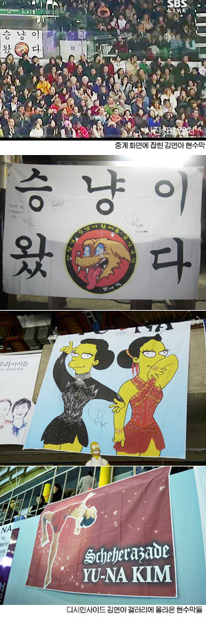 ‘피겨퀸’ 김연아의 팬들도 예외는 아니다. 매 경기마다 방송사 중계 카메라에는 경기장 곳곳에 걸린 화려한 현수막이 비춰지곤 한다.