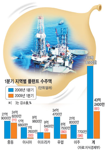 지식경제부와 한국플랜트산업협회는 1분기 해외 플랜트 수주액이 지난해 1분기(112억달러)에 비해 61.3% 감소한 43억달러로 집계됐다고 8일 밝혔다. 1분기 약 25억달러로 전체 수주액의 57%를 차지한 중동이 지난해 1분기(약 28억달러)보다 11% 줄어든 것을 비롯해 미주(-96%), 아시아(-93%), 유럽(-80%), 아프리카(-3%) 등 모든 지역이 감소세를 보였다.