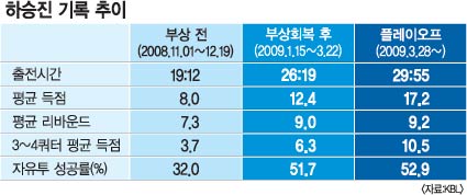 ◇키도 큰 하승진= 하지만 발가락 부상으로 코트를 비운 한 달여 동안 자신을 추스른 하승진은 단점을 보완하기 시작했다. 32%에 그쳤던 자유투 성공률은 복귀 후 51.7%까지 높아졌다. 하승진은 “구토가 나올 정도로 자유투 연습에 매달렸다”고 할 정도로 자신을 채찍질했고 결과는 성공적이었다. 서장훈이 팀 내 불화 끝에 전자랜드로 이적한 뒤 생겨난 공백을 메워야 한다는 책임감도 그의 성장에 촉매 역할을 했다.