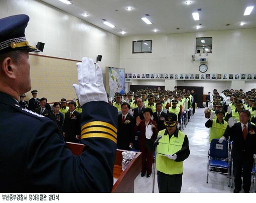김만택 중구의회의장 등 관내 기관장 5명을 비롯한 구의회 의원, 교육·사회단체장 등이 참석해 명예경찰 발대를 축하했다. 특히 이들은 지역발전에 헌신적으로 봉사하고 지역실정에 밝은 명예경찰관들이 민·경 협력치안으로 안전하고 살기 좋은 부산중구 건설에 앞장서 줄 것을 주문했다.