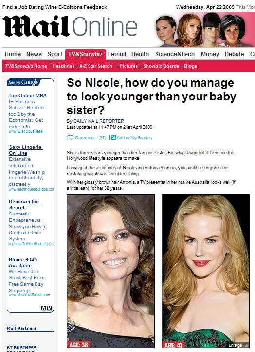 영국 데일리메일은 22일(한국시간) 인터넷판에 두 자매의 사진을 나란히 게재하면서 겉으로 보기에는 니콜이 훨씬 젊어 보이지만 실제로는 앤토니아가 니콜보다 세 살이나 어리다며 두 자매의 차이점은 할리우드 스타냐 아니냐는 차이밖에 없다고 보도했다. 데일리메일은 앤토니아가 호주 방송사에서 기자로 일하고 있으며 현재 네 아이를 둔 엄마라면서 비록 언니 니콜과 비교할 때 나이가 들어보이지만 30대 후반으로서는 매우 매력적인 외모를 가지고 있다고 전했다.