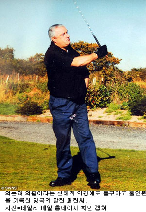 폭발사고로 한 팔과 한 눈을 잃은 전 영국 해병대 출신인 알란 페린씨(45)는 이날 데번주 엑세터 인근 엑스민스터 골프클럽에서 두번째 홀때