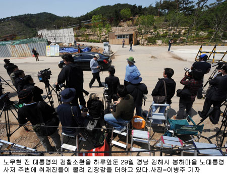 전직 대통령의 검찰 출두 모습을 보도하기 위해 전국에서 모여든 200여명의 취재진은 노 전 대통령의 모습을 포착하기 좋은 장소를 선점하기 위한 싸움에 들어갔다. 또 일부 방송사는 생방송 부스를 설치하고 시험 방송을 준비하는 등 분주한 하루를 보냈다.
