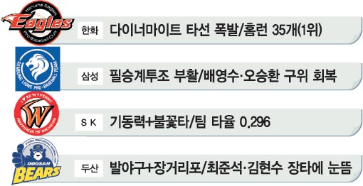 ◇홈런 공장 한화= ‘국민 감독’ 김인식 감독이 이끄는 한화는 18경기를 치른 29일 현재 홈런 35개를 터뜨리며 팀 홈런 1위를 굳게 지키고 있다. ‘다이너마이트 타선’을 자랑하는 한화는 홈런 10걸에 3명이 포진하며 이름값을 톡톡히 해내고 있다. 외국인 선수 디아즈와 ‘꽃범호’ 이범호가 나란히 6개씩을 기록해 공동 3위, 김태균이 5개로 공동 8위에 올라있다. 1번부터 9번까지 누가 홈런을 때려도 전혀 이상하지 않을 정도로 한화 타선은 장타력이 강점이다. 투수들이 컨디션을 끌어올리지 못하고 있어 팀 평균자책은 5.47로 8개 구단 중 7위에 처져있지만 막강한 화력을 앞세워 승수를 쌓고 있다.