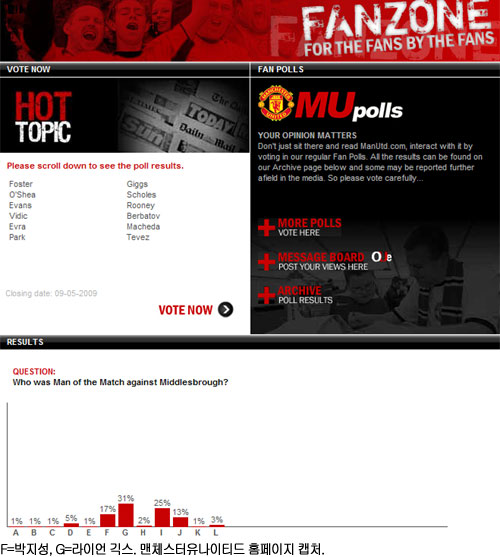 [쿠키 스포츠] 시즌 3호 골을 터뜨린 박지성(28·맨체스터 유나이티드)이 미들즈브러전 최우수선수(MVP)를 뽑는 팬 투표에서 3위를 달리고 있다.