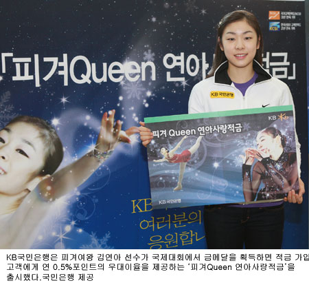 KB국민은행은 피겨여왕 김연아 선수가 국제대회에서 금메달을 획득하면 적금 가입고객에게 연 0.5%포인트의 우대이율을 제공하는 ‘피겨Queen 연아사랑적금’을 7일부터 판매했다.
