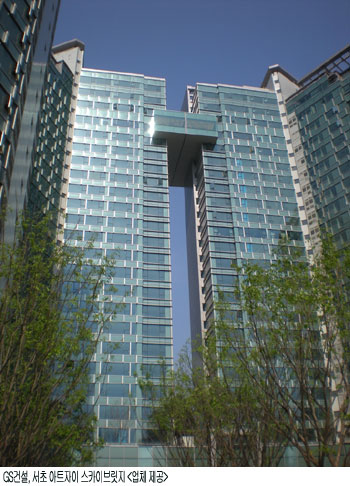 GS건설 관계자는 10일 “아파트내 스카이브릿지에 커뮤니티시설을 설치한 것은 국내 최초”라며 “기술적으로도 두 건물의 강성을 높여 바람 등에 의한 건물 진동을 줄여주고 화재 등 긴급 상황에서는 피난통로로 사용할 수 있다는 장점이 있다”고 강조했다. GS건설은 다음달 입주하는 서초자이 자이언 센터를 준공 전까지 일반에게 공개키로 했다.