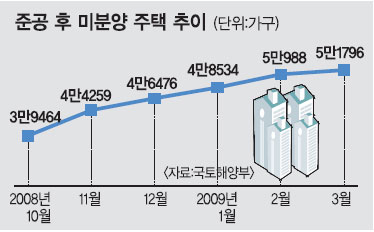 또 국토해양부는 3월 전국 미분양주택이 16만5641가구로 사상 최대를 기록한 가운데 지방은 13만7041가구였다고 밝혔다. 특히 ‘악성 미분양’으로 불리는 준공후 미분양주택 5만1796가구 중 지방은 4만9718가구(96%)에 달했다. 국민일보 쿠키뉴스 최정욱 기자