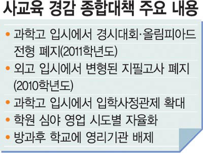 [쿠키 사회] 2011학년도 과학고 입시부터 올림피아드 등 각종 경시대회 특별 전형이 폐지된다. 외고 입시에서는 2010학년도부터 중학교 교과과정을 뛰어넘는 문제 출제가 금지된다. 논란이 된 학원 심야교습 금지 입법은 사실상 무산됐다.