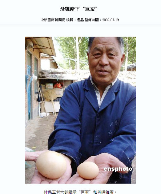 20일 중국뉴스네트워크(www.chinanews.com.cn) 보도에 따르면 중국 산둥성에 사는 농민 푸아오위씨가 사육 중인 8마리 닭 중 한 마리가 최근 182g의 달걀을 낳았다.