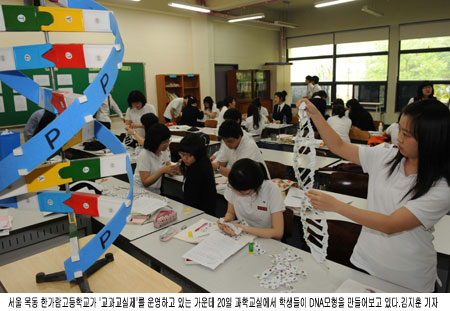 [쿠키 사회] 서울 목동 한가람고등학교를 찾은 20일 오후 2시50분. 6교시 수업 종료를 알리는 종이 울리자 교재와 필통을 손에 든 학생들이 각 교실에서 쏟아져 나왔다. 교실엔 저마다 교과목 이름과 담당 교사의 사진이 붙어 있었다. 수업 일정이 모두 끝난 학생은 종례 후 집으로 돌아갔고, 7·8교시 수업이 남은 학생은 해당 교사가 기다리는 교실로 발걸음을 옮겼다. 이 학교는 학생이 직접 시간표를 짜고 그에 맞춰 교실을 옮겨다니며 공부하는 교과교실제를 3년째 운영 중이다.