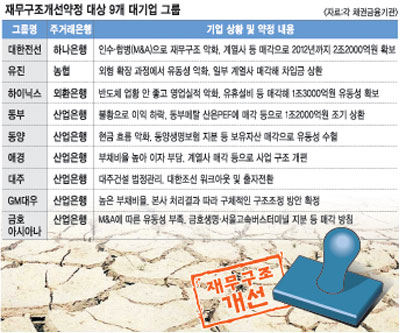 1일 금융당국과 채권단 등에 따르면 43개 주채무계열 중 9개 그룹이 재무구조개선약정 대상으로 선정돼 주채권은행과 약정을 맺었다.