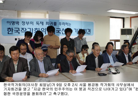 [쿠키 문화] 진보 성향 문학인들의 대표적인 단체인 한국작가회의(이사장 최일남)는 9일 오후 2시 서울 용강동 작가회의 사무실에서 기자회견을 열고 시국선언문을 발표했다. 시국선언에는 작가회의 소속 문학인 513명이 서명했다.