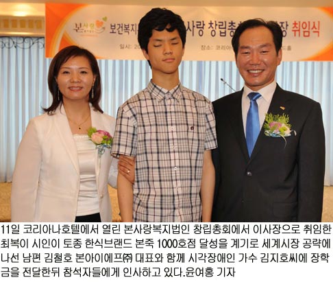 12일 오후 1시쯤 서울 코리아나호텔 4층에서 열린 '본사랑 복지법인 창립총회 및 취임식'에서 이사장으로 취임한 최복이(46·시인) 본브랜드연구소장은 "본죽을 만들어 남편을 통해 사업화에 성공한뒤 개인적으로 아무도 몰래 해온 일을 이제는 뜻을 가진 분들과 힘을 합해 글로벌 나눔문화로 꽃피우기위해 이 자리에 섰다"며 이렇게 말했다.