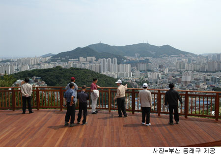이번에 설치된 전망데크는 북장대 앞 142㎡ 규모로 2억여원의 사업비로 자연경관을 고려해 친환경적 생태적으로 조성됐다. 이와 함께 동래읍성 북문 앞 에어로빅장에서 북장대 구간 등산로 40m도 목재데크 계단으로 정비했다.