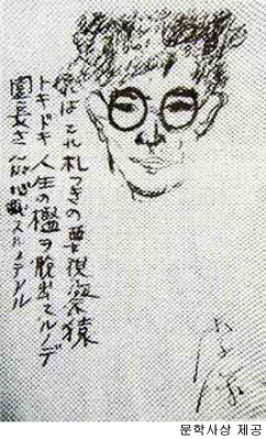 연필 또는 펜으로 그린 간단한 스케치 형식의 이 그림에는 안경을 쓴 남자의 얼굴, 그 왼쪽에 일본어로 쓴 문구가 적혀 있다. 우측 하단에는 이상의 자필 사인이 표시돼 있다.
