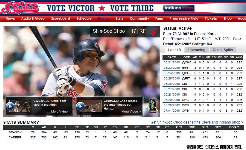 추신수(27·클리블랜드 인디언스)가 한 경기에서 3차례 삼진을 당했다. 추신수는 2일(이하 한국시간) 오하이오주 클리블랜드의 프로그레시브 필드에서 열린 2009 미국 프로야구 메이저리그 시카고 화이트 삭스와의 경기에 4번 타자 우익수로 출전했다. 성적은 4타수 1안타 1타점 3삼진. 6월28일 신시내티 레즈전부터 5경기 연속 삼진이다.