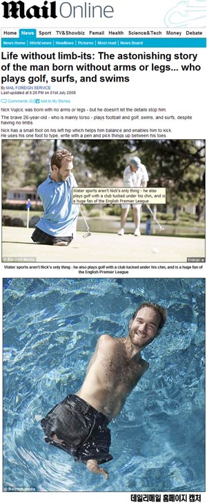 선천적인 기형으로 팔·다리가 없이 태어난 닉 뷰이치치(26)의 역경을 이겨내며 살아가는 삶이 언론을 통해 전해지면서 세계인들에게 잔잔한 감동을 주고 있다. 영국 일간지 데일리메일 인터넷판은 2일(한국시간) 팔과 다리가 없지만 축구, 골프, 수영, 서핑 등을 즐기는 것은 물론 전 세계를 돌아다니며 희망을 전파하고 있는 호주 출신 뷰이치치의 이야기를 실었다.