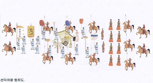 2그룹은 기마무관을 선두로 왕의 깃발을 든 기수병, 무관을 앞장 세우고 선덕여왕이 행차를 한다. 선덕여왕 뒤로는 시녀, 호위군, 신라 귀족인 대등, 김춘추 및 김유신, 십화랑, 원화가 위용을 뽐낸다. 3그룹은 뒤에서 호위하는 군사, 여러 관직의 신료, 시녀들의 행렬로 이뤄진다.