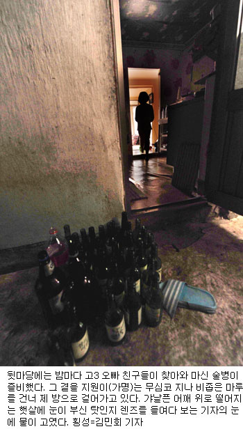 [쿠키 사회] 강원도 횡성에 살고 있는 지원(10·가명)이의 집 대문을 열고 들어서자 빈 소주 세 병과 맥주 페트병 하나가 앞 뜰에 뒹굴고 있었다.